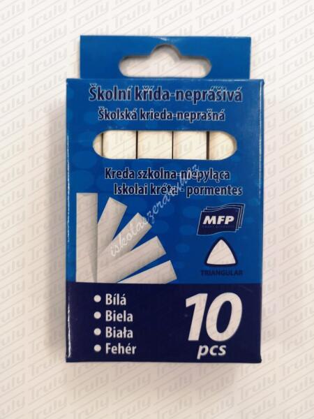 MFP fehér táblakréta 10 darabos Háromszögletű, pormentes iskolai fehérkréta készlet – elsősorban iskolatáblára való írásra, de tökéletesen megállja a helyét fali- vagy aszfaltkrétaként is.